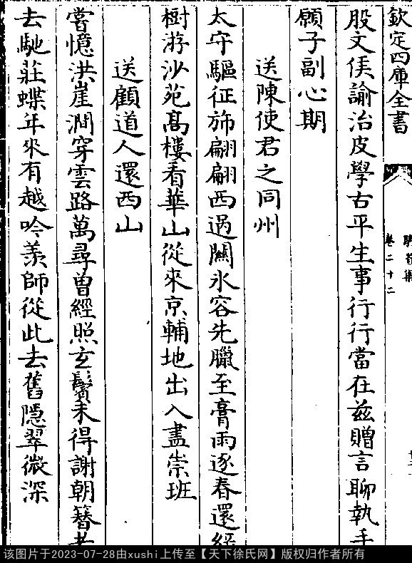 送陈使君之同州(988年) 五代至宋初 · 徐铉 五言律诗 押删韵 创作地点:河南省开封市 太守驱征旆,翩翩西过关。 冰容先腊至,膏雨逐春还。 绿树游沙苑,高楼看华山。 从来京辅地,出入尽崇班。 出处:《騎省集-宋-徐鉉》卷二十二(第 12b - 13a 頁)