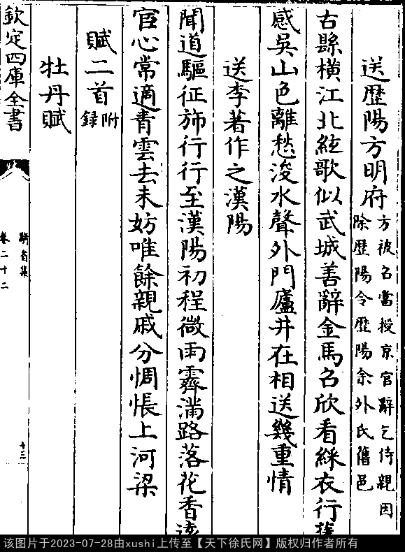 送李著作之汉阳 五代至宋初 · 徐铉 五言律诗 押阳韵 闻道驱征旆,行行至汉阳。 初程微雨霁,满路落花香。 远宦心常适,青云去未妨。 惟馀亲戚分,惆怅上河梁(以上《徐公文集》卷二二)。 出处:《騎省集-宋-徐鉉》卷二十二(第 13a - 13b 頁)