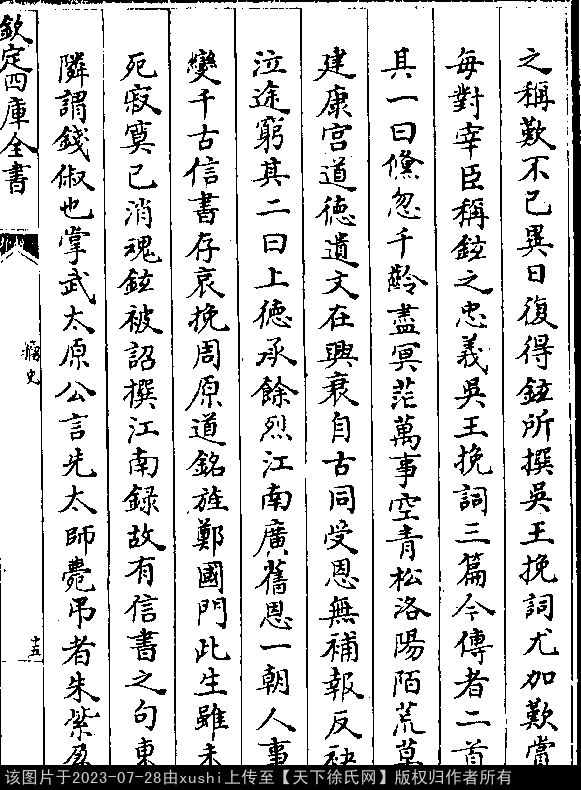 吴王挽词 其一 (978年10月) 五代至宋初 · 徐铉 五言律诗 押东韵 创作地点:河南省开封市 倏忽千龄尽,冥茫万事空。 青松洛阳陌,荒草建康宫。 道德遗文在,兴衰自古同。 受恩无补报,反袂泣途穷。 其二 (978年10月) 五言律诗 押元韵 创作地点:河南省开封市 土德承馀烈,江南广旧恩。 一朝人事变,千古信书存。 哀挽周原道,铭旌郑国门。 此生虽未死,寂寞已销魂(宋魏泰《东轩笔录》卷一〖按:原三首,魏泰仅录二首。)。 出处:《籀史-宋-翟耆年》籀史 籀史(第 15a - 15b 頁)