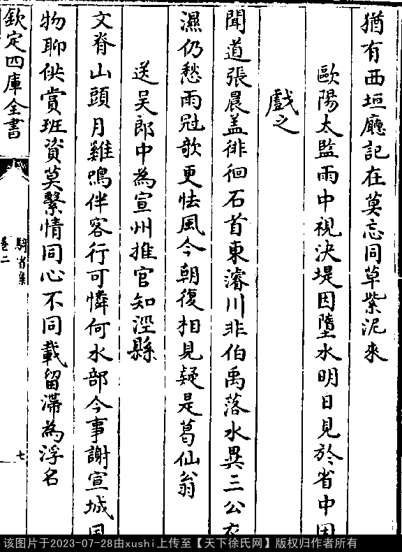 文化 欧阳大监雨中视决堤因堕水明日见于省中因戏之 五代至宋初 · 徐铉