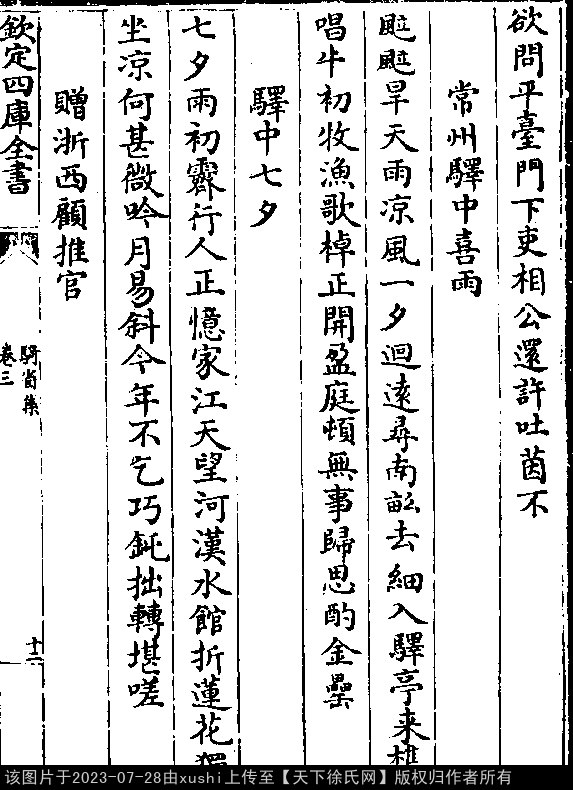 驿中七夕 五代至宋初 · 徐铉 五言律诗 押麻韵 七夕雨初霁,行人正忆家。 江天望河汉,水馆折莲花。 独坐凉何甚,微吟月易斜。 今年不乞巧,钝拙转堪嗟。 出处:《騎省集-宋-徐鉉》卷三(第 12a - 12b 頁)