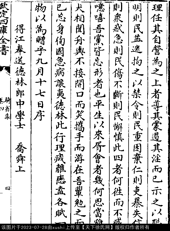 德林始以才术优赡,入参近司。旋以地望清雅,宠登书殿。会东畿克复,上以君有遗爱于淮海之都,故辍侍从之班,摄尹正之任。吾一二亲友,共饯行舟。铉也不才,请以言赠。理大国若烹小鲜,言不可挠之也,况乱后乎?德林当本仁守信,体宽务断。大兵之后,民各思乂,听其自理,任其自营。为之上者,导其蒙,遏其淫而已。示之以聪明,则民益迷;拘之以禁令,则民重困。弃仁则吏暴,失信则众惑。急则民伤,不断则民懈,慎此四者,何往而不臧!噫嘻!吾党皆忘形者也,平生以来,胥会者几何!思当鸡犬相闻,舟舆不接,开口而笑,携手而游,在吾辈勉之而已。忘身徇国,急病让夷,德林此行,宜减离恋,盍各赋一物以为赠乎?九月十七日序。