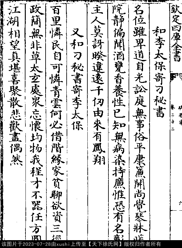 文化 又和刁秘书寄李太保 五代至宋初 · 徐铉