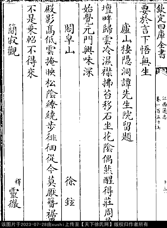 阁皂山(961年11月) 五代至宋初 · 徐铉 七言绝句 押灰韵 创作地点:江西省吉安市新干县阁皂山 殿影高低云掩映,松阴缭绕步徘徊。 从今莫厌簪裾累,不是乘轺不得来。 出处:《江西通志-清-謝旻》卷一百五十七(第 13b - 14a 頁)