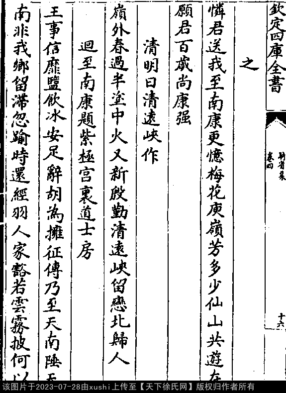 朱处士相与有山水之愿见送至南康作此以别之(961年11月) 五代至宋初 · 徐铉 七言绝句 押阳韵 创作地点:江西省赣州市南康区 怜君送我至南康,更忆梅花庾岭芳。 多少仙山共游在,愿君百岁尚康强。 出处:《騎省集-宋-徐鉉》卷四(第 16b - 17a 頁)