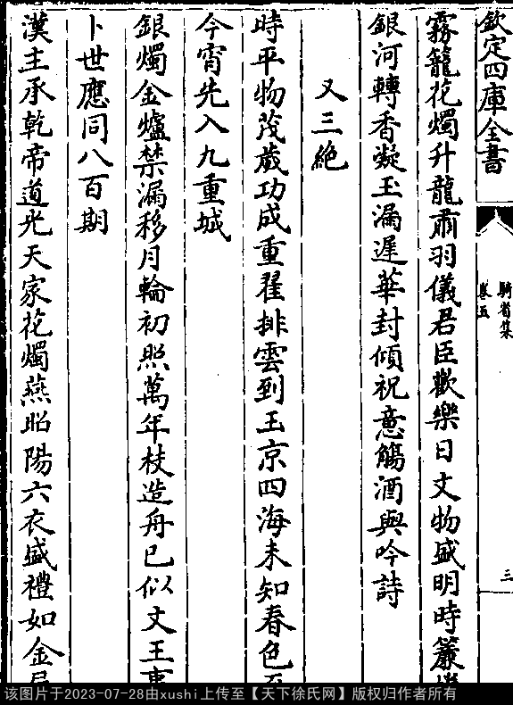 纳后夕侍宴又三绝 其一 五代至宋初 · 徐铉 七言绝句 押庚韵 时平物茂岁功成,重翟排云到玉京。 四海未知春色至,今宵先入九重城。 其二 七言绝句 押支韵 银烛金炉禁漏移,月轮初照万年枝。 造舟已似文王事,卜世应同八百期。 其三 七言绝句 押阳韵 汉主承乾帝道光,天家花烛宴昭阳。 六衣盛礼如金屋,彩笔分题似柏梁。 出处:《騎省集-宋-徐鉉》卷五(第 3b - 4a 頁)
