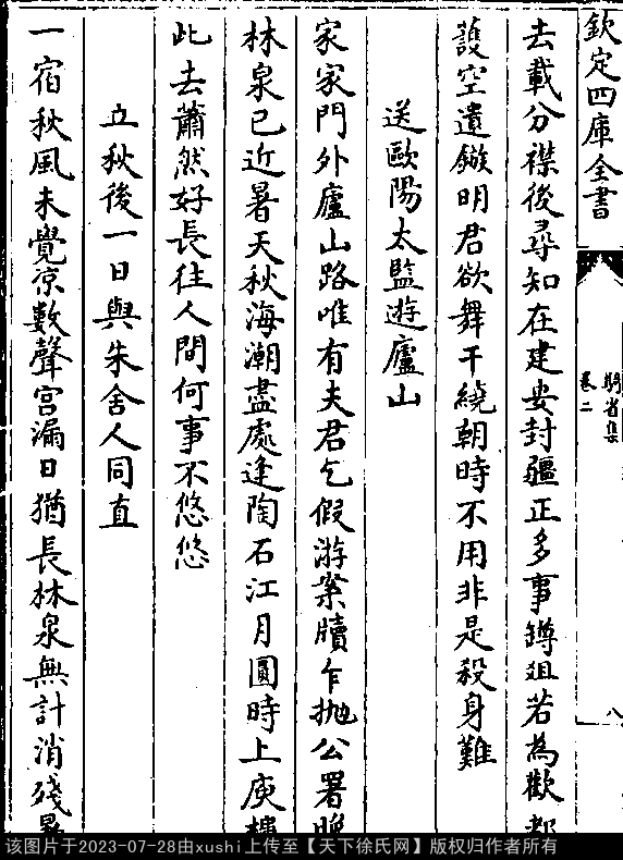 送欧阳大监游庐山 五代至宋初 · 徐铉 七言律诗 押尤韵 家家门外庐山路,唯有夫君乞假游。 案牍乍抛公署晚,林泉已近暑天秋。 海潮尽处逢陶石,江月圆时上庾楼。 此去萧然好长往,人间何事不悠悠。 出处:《騎省集-宋-徐鉉》卷二(第 8b - 9a 頁)