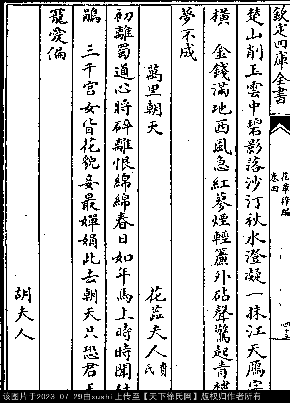 采桑子(途中作) 前蜀 · 花蕊夫人 押先韵 出处:全唐诗续补遗 初离蜀道心将碎,离恨绵绵。 春日如年,马上时时闻杜鹃。 三千宫女皆花貌,妾最婵娟。 此去朝天,只恐君王宠爱偏(见《能改斋漫录》卷十六。)。 出处: 《花草稡編-明-陳耀文》卷四(第 43b - 44a 頁)