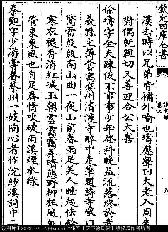 春日醉中作 北宋 · 徐璹 押沃韵 惊雷殷殷南山曲,一夜山前春雨足。 美人睡起怯轻寒,衣褪香绡红减玉。 朝云霭霭弄晴态,野柳狂花无管束。 东风也自足春情,吹皱两溪烟水绿(宋方勺《泊宅编》卷上 《泊宅编》:徐璹疏俊不事事,少年登科。晚益流落,终于武义县主簿。尝寓婺州清涟寺,醉中走笔题诗寺壁云云。)。 出处:《泊宅編-宋-方勺》泊宅編 卷上(第 5b - 6a 頁)