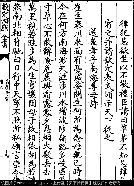 送崔孝子南海寻母诗 元末明初 · 徐一夔 押词韵第三部 出处:槜李诗系卷六 崔生秦川来,面有忧戚姿。 问生何所为,念母无巳时。 母今在何方,南海渺天涯。 涉川水增波,陟岭路多岐。 区区寸草心,不敢辞险危。 晨兴霜露零,夕息烟火微。 去去一万里,视若跬步为。 人生穹壤间,母子故相依。 胡为若鸿燕,南北相背驰。 白日行中天,宁不照所私。 愿言崇令德,远大以为期。 出处:《檇李詩繫-清-沈季友》卷六(第 19a - 20a 頁)