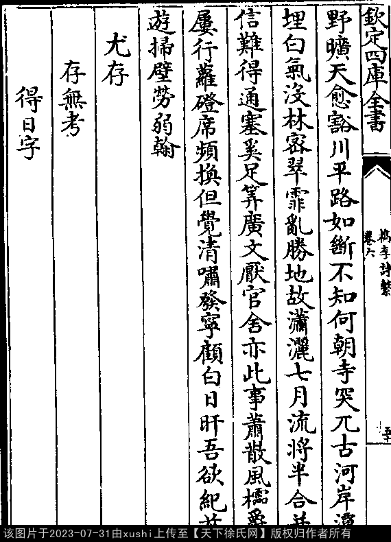 至正辛丑秋七月十有三日唱和诗得半字 元末明初 · 徐一夔 押翰韵 出处:槜李诗系卷六 野旷天愈豁,川平路如断。 不知何朝寺,突兀古河岸。 潭埋白气没,林密翠霏乱。 胜地故潇洒,七月流将半。 合并信难得,通塞奚足算。 广文厌官舍,亦此事萧散。 风棂爵屡行,萝磴席频换。 但觉清啸发,宁顾白日旰。 吾欲纪兹游,扫壁劳弱翰。 出处:《檇李詩繫-清-沈季友》卷六(第 50b - 51a 頁)
