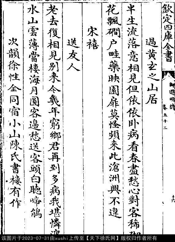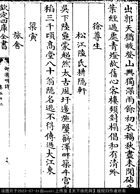 松江陆氏耕隐轩 元末明初 · 徐尊生 五言律诗 押东韵 出处:御选明诗卷五十二 吴下陆龟蒙,超然太古风。 圩边施蟹簖,泽畔筑牛宫。 香稻三千顷,高堂八十翁。 隐名逃不得,传过大江东。 出处: 《御選宋金元明四朝詩-清-聖祖玄燁》御選宋金元明四朝詩 御選明詩卷五十二(第 17a - 17b 頁)