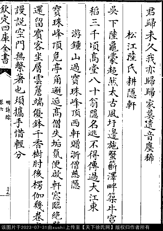 游钟山过宝珠峰顶西轩赠浙僧慈隐 元末明初 · 徐尊生 七言律诗 押文韵 出处:御选明诗卷七十二 宝珠峰顶危亭角,邂逅高僧失垢氛。 便启轩窗临绝壁,还留宾客坐层云。 檐端优钵千香树,肘后楞伽几卷文。 谩说空门无系著,也须携手惜轻分。 出处: 《明詩綜-清-朱彝尊》卷六(第 29a - 29b 頁)