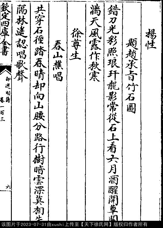 出处:《御選宋金元明四朝詩-清-聖祖玄燁》御選宋金元明四朝詩 御選明詩卷一百三(第 6a - 6b 頁)
