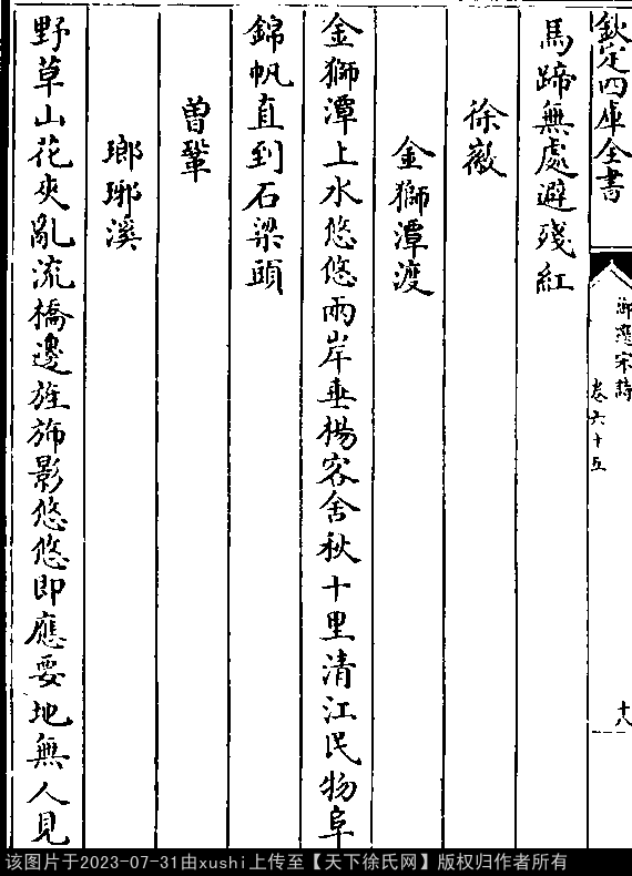 金狮潭渡 宋 · 徐徽 七言绝句 押尤韵 金狮潭上水悠悠,两岸垂杨客舍秋。 十里清江民物阜,锦帆直到石梁头(元陈世隆《宋诗拾遗》卷六)。 出处:《御選宋金元明四朝詩-清-聖祖玄燁》卷六十五(第 18b - 19a 頁)