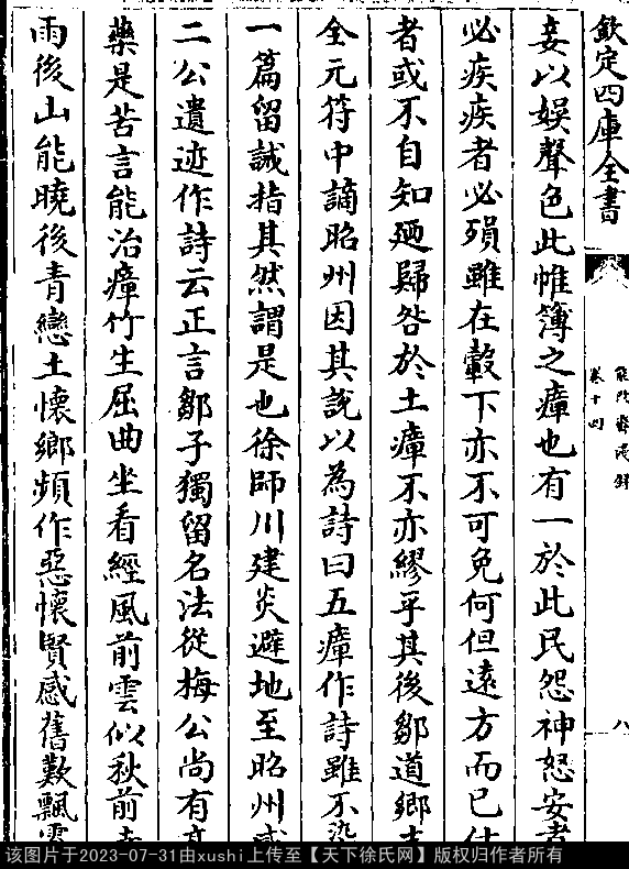 昭州感梅公挚邹道乡遗迹 宋 · 徐俯 七言律诗 押青韵 正言邹子独留名,法从梅公尚有亭。 药是苦言能治瘴,竹生屈曲坐看经。 风前云似秋前赤,雨后山能烧后青。 恋土怀乡频作恶,怀贤感旧叹飘零(同上书卷一四)。 出处:《能改齋漫錄-宋-吳曾》卷十四(第 8b - 9b 頁)