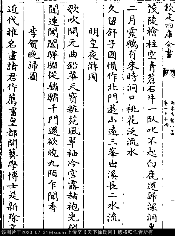 李贺晚归图 宋 · 徐俯 五言律诗 押鱼韵 近代推名画,诸君作荐书。 皇都开艺学,博士是新除。 高柳长安道,乱云昌谷居。 丹青聊至此,仆马晚归欤。 出处: 《兩宋名賢小集-宋-陳思》卷一百十四(第 3b - 4b 頁)