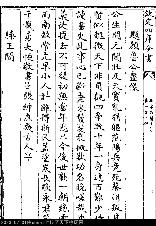 滕王阁 其一 宋 · 徐俯 五言律诗 押尤韵 一日逢(《江西诗徵》卷一四作君)王造,千年与客游。 云边梅岭出,坐上赣江流。 日落回飞鸟,烟深失钓舟。 蝉声枯柳外,天地晚风秋。 其二 五言律诗 押庚韵 云气浮高栋,波澜绕古城。 雨馀山更碧,叶下水逾清。 燕语留秋色,鸦声落晚晴。 昔王歌舞地,帆急见山行。 出处: 《兩宋名賢小集-宋-陳思》卷一百十四(第 2a - 2b 頁)