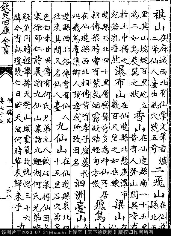 九仙山 宋 · 徐师仁 押虞韵 晨逾九仙山,暮访九鲤湖。 何氏兄弟跨鲤鱼,同时轻举排天衢。 山头云气故恍惚,三十六鳞今有无。 琼浆白日醉天酒,何时华表归来乎(宋李俊甫《莆阳比事》卷七)。 出处:《明一統志-明-李賢》卷七十七(第 38a - 38b 頁)