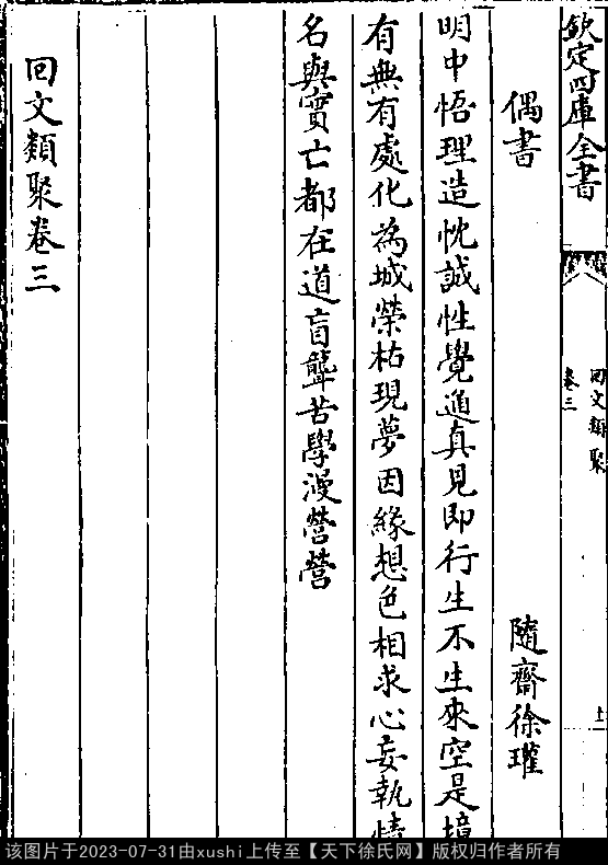 偶书 宋 · 徐瓘 七言律诗 押庚韵 明中悟理造忱诚,性觉通真见即行。 生不生来空是境,有无有处化为城。 荣枯现梦因缘想,色相求心妄执情。 名与实亡都在道,盲聋苦学漫营营(以上宋桑世昌《回文类聚》卷三)。 出处:《囘文類聚-宋-桑世昌》囘文類聚 卷三(第 11b 頁)