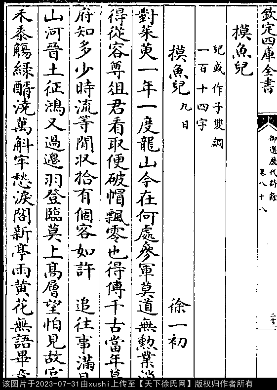 摸鱼儿 宋 · 徐一初 押词韵第四部 对茱萸、一年一度。 龙山今在何处。 参军莫道无勋业,消得从容尊俎。 君看取。 便破帽飘零,也博名千古。 当年幕府。 知多少时流,等闲收拾,有个客如许。 追往事,满目山河晋土。 征鸿又过边羽。 登临莫上高层望,怕见故宫禾黍。 觞绿醑。 浇万斛牢愁,泪阁新亭雨。 黄花无语。 毕竟是西风,朝来披拂,犹忆旧时主。 出处: 《御選歷代詩餘-清-聖祖玄燁》御選歷代詩餘 卷八十八目録(第 27b - 28a 頁)