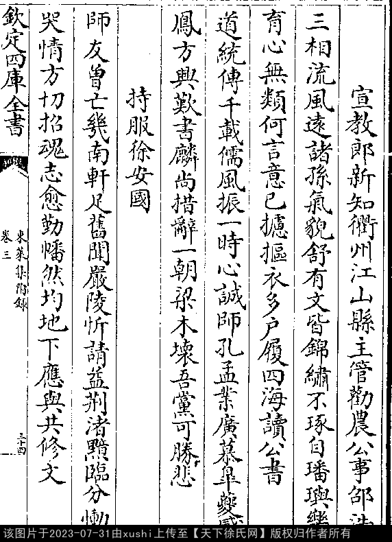 哀吕东莱 其一 宋 · 徐安国 五言律诗 押文韵 师友曾亡几,南轩足旧闻。 严陵忻请益,荆渚黯临分。 恸哭情方切,招魂志愈勤。 幡然均地下,应与共修文。 其二 五言律诗 押先韵 感涕门阑旧,由来岂苟然。 茶山参活法,婺女拾残编。 记录书犹在,忘言意已传。 续灯身后事,先是有同年(宋吕祖谦《东莱集》附录卷三)。 出处: 《東萊集-宋-呂祖謙》東萊集 附錄卷三(第 34b - 35a 頁)