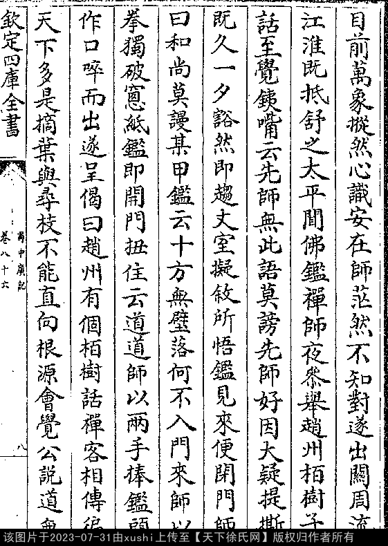 呈佛鉴禅师偈 南宋 · 释心道 赵州有个柏树话,禅客相传遍天下。 多是摘叶与寻枝,不能直向根源会。 觉公说道无此语,正是恶言当面骂。 禅人若具通方眼,好向此中辨真假。 出处: 《蜀中廣記-明-曹學佺》卷八十六(第 8a - 9a 頁)