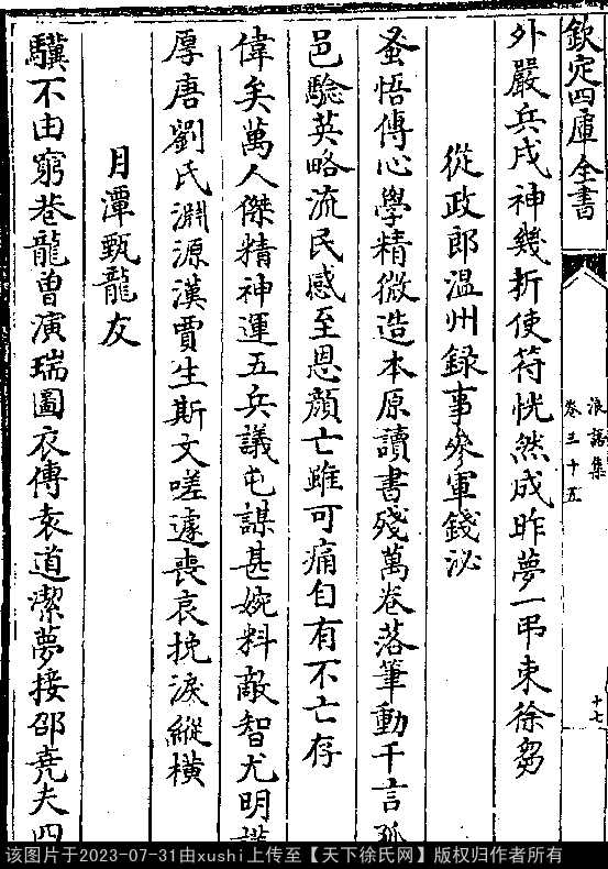 挽薛艮斋 南宋 · 徐定 七言律诗 押支韵 今古名流特地奇,生平学术得真师。 缵将管乐为操蕴,论切周唐入设施。 经理远模归使节,抚循中道称藩麾。 堪惊四十成埋玉,叹息襟期有未为(宋薛季宣《浪语集》卷三五)。 出处: 《浪語集-宋-薛季宣》卷三十五(第 18b - 19a 頁)