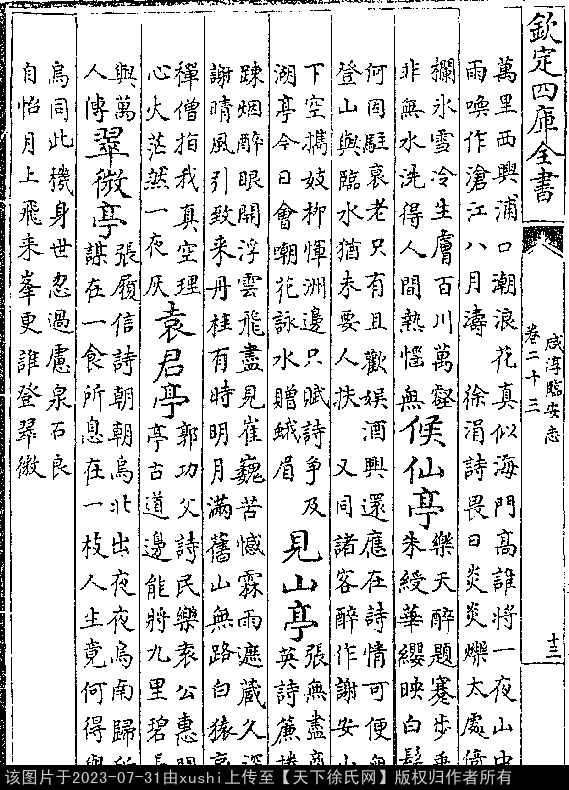 冷泉亭 南宋 · 徐涓 七言绝句 押虞韵 畏日炎炎烁太虚,倚栏冰雪冷生肤。 百川万壑非无水,洗得人间热恼无(宋潜说友《咸淳临安志》卷二三)。 出处: 《咸淳臨安志-宋-潛說友》卷二十三(第 13b - 14a 頁)