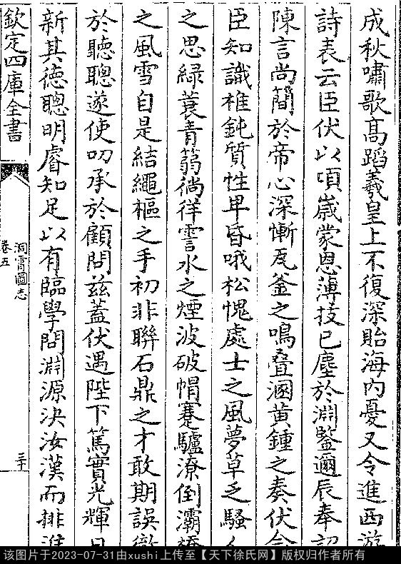 奉和御制秋怀诗二首 其一 南宋 · 徐冲渊 七言律诗 押尤韵 东壁星辰烂不收,夜凉河汉截天流。 芙蓉院静琴三叠,翡翠帘开月一钩。 黄屋非心辞大宝,碧云有意思高秋。 金声玉振掩前作,汉祖空怀猛士忧。 其二 七言律诗 押尤韵 天末虹蜺晚未收,龙池新雨涨清流。 鸥缘适意频依渚,鱼不贪香懒上钩。 剩喜三边无警报,况当万宝得成秋。 啸歌高蹈羲皇上,不复深贻海内忧(宋邓牧《洞霄图志》卷五)。 出处: 《洞霄圖志-宋-鄧牧》卷五(第 29b - 30b 頁) |