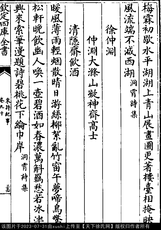 清隐斋饮酒 南宋 · 徐冲渊 押翰韵 暖风薄雨轻烟散,晴日游丝飞絮乱。 竹窗午梦啼鸟惊,松轩晚饮幽人唤。 一壶碧酒如春浓,万斛羁愁若冰泮。 兴来索笔谩题诗,碧桃花下纶巾岸(以上同上书卷六)。 出处: 《宋詩紀事-清-厲鶚》卷九十(第 34a - 34b 頁)
