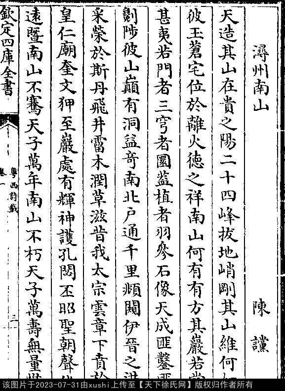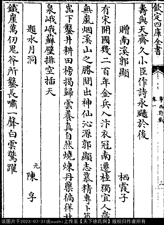 赠南溪郭显 南宋 · 徐冲渊 四言诗 押先韵 出处:粤西诗载卷一 有宋开国,几二百年。 金兵入汴,衣冠南迁。 桂独宜人,岁无岚烟。 溪山之胜,间出神仙。 沁源郭显,志慕精专。 卜筑嵓下,凿井耕田。 榜揭归云,养真自然。 烧炼丹药,徜徉林泉。 峨峨藓壁,排空插天。 出处: 《粵西詩載-清-汪森》卷一(第 3b - 4a 頁)