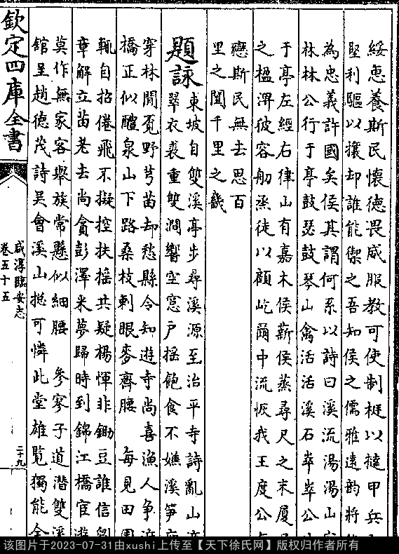 新亭 南宋 · 徐观 四言诗 溪流汤汤,山容林林。 公行于亭,鼓瑟鼓琴。 山禽聒聒,溪石崒崒。 公休于亭,左经右律。 山有佳木,侯薪侯蒸。 寻尺之木,厦屋之楹。 渒彼容苀舠,蒸徒以顾。 屹尔中流,恢我王度。 公无恋斯,民无去思。 百里之闿,千里之畿(清于尚龄道光《昌化县志》卷一八《三衢徐观新亭记》)。 出处: 《咸淳臨安志-宋-潛說友》卷五十五(第 29a - 29b 頁)