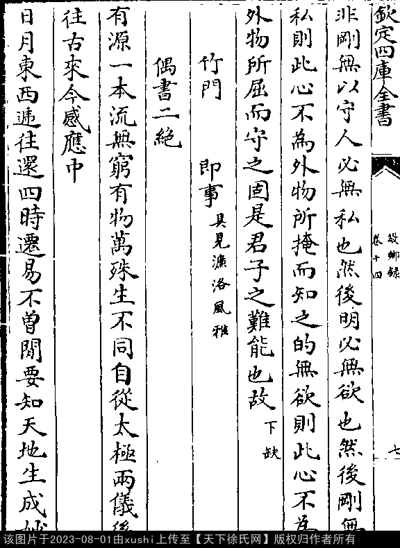 偶书 其一 南宋 · 徐侨 七言绝句 押东韵 有原一本流无穷,有物万殊生不同。 自从太极两仪后,往古来今感应中。 其二 七言绝句 押删韵 日月东西递往还,四时迁易不曾閒。 要知天地生成妙,只在阴阳进退间(同上书卷五)。 出处:《敬鄉錄-元-吳師道》卷十四(第 7b - 8b 頁)