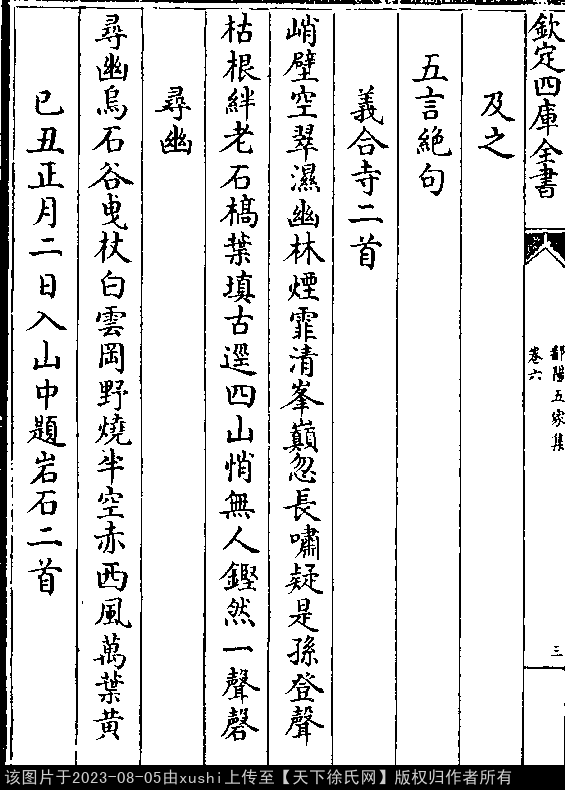 己丑正月二日入山中题岩石二首 其一 南宋 · 徐瑞 五言绝句 押侵韵 一掬岩下水,不满数寸深。 当其伏坎时,已有东注心。 其二 五言绝句 押语韵 我访桃源人,桃源在何处。 世上无桃源,何必移家去。 出处: 《鄱陽五家集-清-史簡》卷六(第 4a - 4b 頁)