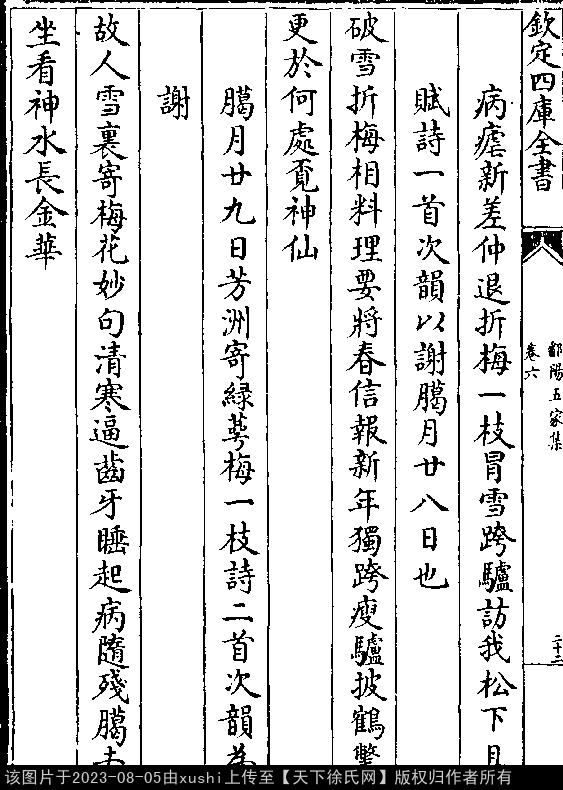 病疟新差仲退折梅一枝冒雪跨驴访我松下且赋诗一首次韵以谢腊月廿八日也 南宋 · 徐瑞 七言绝句 押先韵 破雪折梅相料理,要将春信报新年。 独跨瘦驴披鹤氅,更于何处觅神仙。 出处: 《鄱陽五家集-清-史簡》卷六(第 22b - 23a 頁)