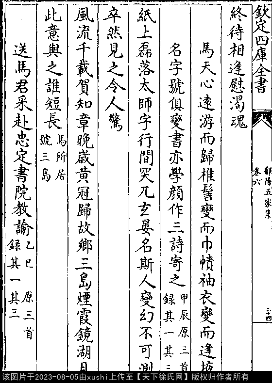 马天心远游而归椎髻变而巾帻袖衣变而逢掖名字号俱变书亦学颜作三诗寄之(甲辰(原注:三首录其一、其三。)) 其一 南宋 · 徐瑞 七言绝句 押庚韵 纸上磊落太师字,行间突兀玄晏名。 斯人变幻不可测,卒然见之令人惊。 其二 七言绝句 押阳韵 风流千载贺知章,晚岁黄冠归故乡。 三岛烟霞镜湖月,此意与之谁短长(自注:马所居号三岛。)。 出处: 《鄱陽五家集-清-史簡》卷六(第 24b - 25a 頁)