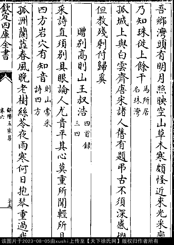 赠别高则山王叔浩(原注:四首录三、四。) 其一 南宋 · 徐瑞 七言绝句 押侵韵 采诗直须别具眼,论人尤贵平其心。 莫重所闻轻所见,四方岩穴有知音(自注:则山常采诗四方。)。 其二 七言绝句 押寒韵 孤洲兰蕊春风晚,老树丝苓夜雨寒。 何日抱琴重过我,焚香煮茗听君弹。 出处: 《鄱陽五家集-清-史簡》卷六(第 25a - 26a 頁)