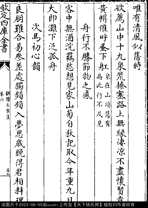登钓台 其一 南宋 · 徐瑞 七言绝句 押支韵 雪手升堂读古碑,先生应笑鬓成丝。 满庭黄叶无人扫,唯有清风似旧时。 其二 七言绝句 押先韵 欲荐山中十九泉,荒榛塞路上无缘。 凄凉不尽怀贤意,黄帽催呼蚤下船(自注:泉在山顶,旧有扁,此行不及见。)。 出处: 《鄱陽五家集-清-史簡》卷六(第 27a - 27b 頁)