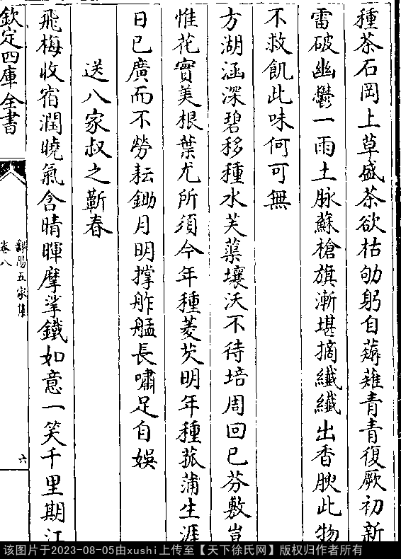 文化 送八家叔之蕲春 南宋 · 徐瑞