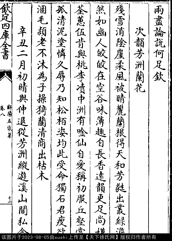 辛丑二月初晴与仲退从芳洲纵游溪山间私念吾党会聚殆不偶然赋古诗一首后五百岁有知音者于吾诗物色可乎(时大德五年) 南宋 · 徐瑞