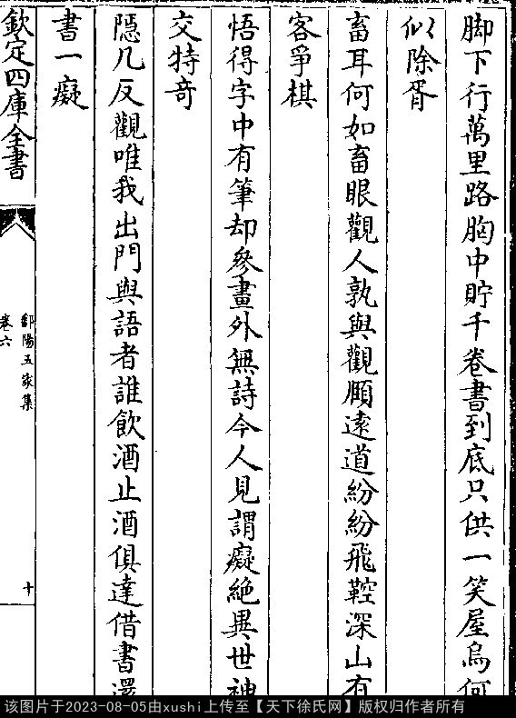 六言四首 其一 南宋 · 徐瑞 六言诗 押鱼韵 脚下行万里路,胸中贮千卷书。 到底只供一笑,屋乌何似除胥。 其二 六言诗 押支韵 畜耳何如畜眼,观人孰与观颐。 远道纷纷飞鞚,深山有客争棋。 其三 六言诗 押支韵 悟得字中有笔,却参画外无诗。 今人见谓痴绝,异世神交特奇。 其四 六言诗 押支韵 隐几反观唯我,出门与语者谁。 饮酒止酒俱达,借书还书一痴。 出处: 《鄱陽五家集-清-史簡》卷六(第 10a - 10b 頁)