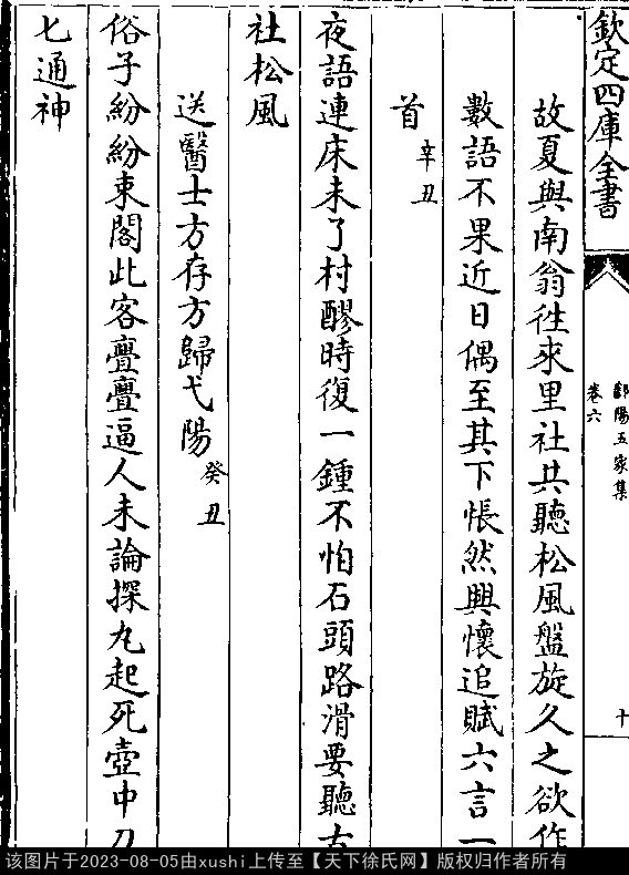 故夏与南翁往来里社共听松风盘旋久之欲作数语不果近日偶至其下怅然兴怀追赋六言一首 南宋 · 徐瑞 六言诗 押词韵第一部 夜语连床未了,村醪时复一钟。 不怕石头路滑,要听古社松风。 出处: 《鄱陽五家集-清-史簡》卷六(第 10b - 11a 頁)