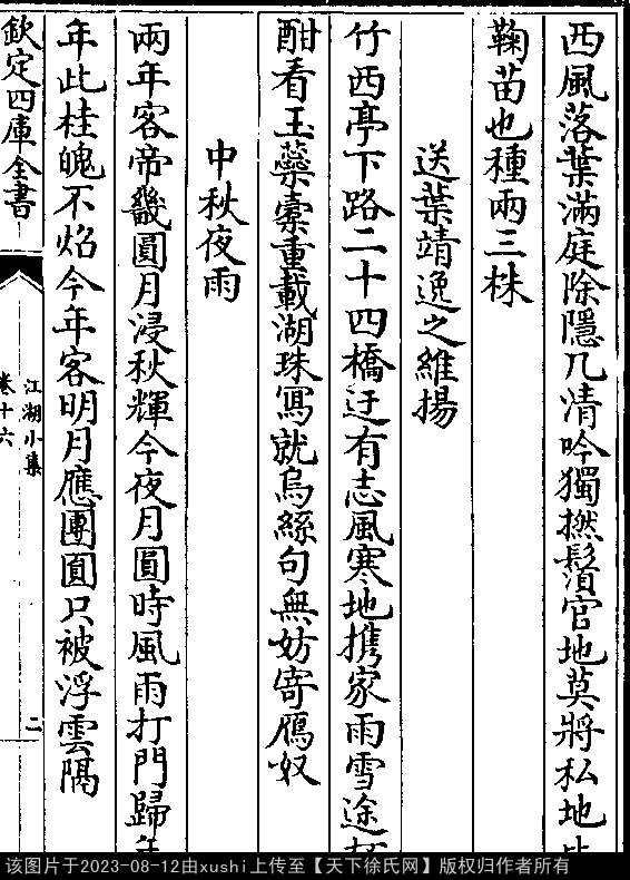 送叶靖逸之维扬 南宋 · 徐集孙 五言律诗 押虞韵 竹西亭下路,二十四桥迂。 有志风寒地,携家雨雪途。 杯酣看玉蕊,橐重载湖珠。 写就乌丝句,无妨寄雁奴。 出处: 《江湖小集-宋-陳起》卷十六(第 2a - 2b 頁)