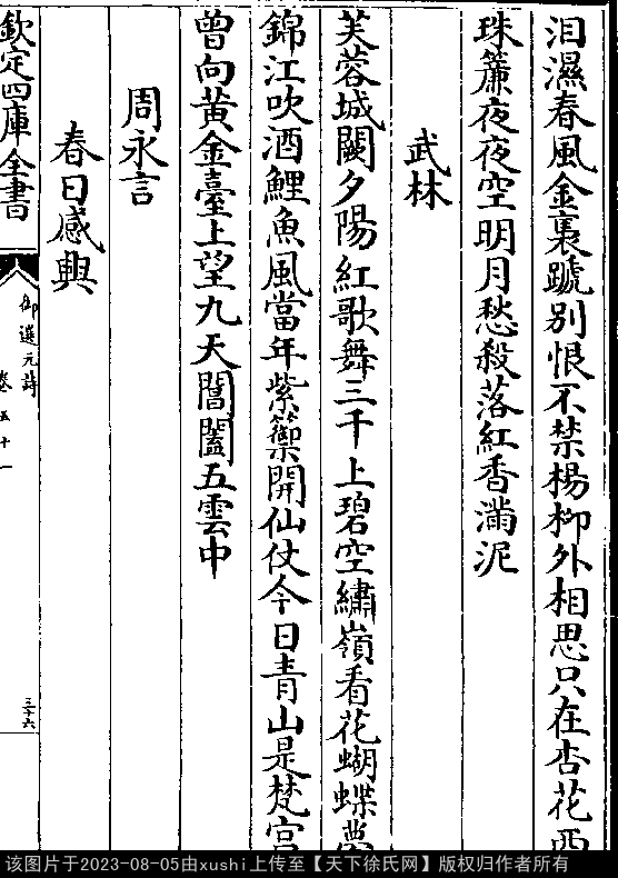 武林 元 · 徐秋云 七言律诗 押东韵 出处:御选元诗卷五十一 芙蓉城阙夕阳红,歌舞三千上碧空。 绣岭看花蝴蝶梦,锦江吹酒鲤鱼风。 当年紫籞开仙仗,今日青山是梵宫。 曾向黄金台上望,九天阊阖五云中。 出处: 《御選宋金元明四朝詩-清-聖祖玄燁》御選宋金元明四朝詩 御選元詩卷五十一(第 36a - 36b 頁)