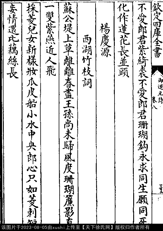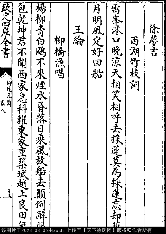 和西湖竹枝词 元 · 徐梦吉 押先韵 雷峰港口晚凉天,相唤相呼去采莲。 莫为采莲忘却藕,月明风定好回船。 出处: 《御選宋金元明四朝詩-清-聖祖玄燁》御選宋金元明四朝詩 御選元詩卷八(第 33a - 33b 頁)