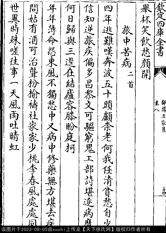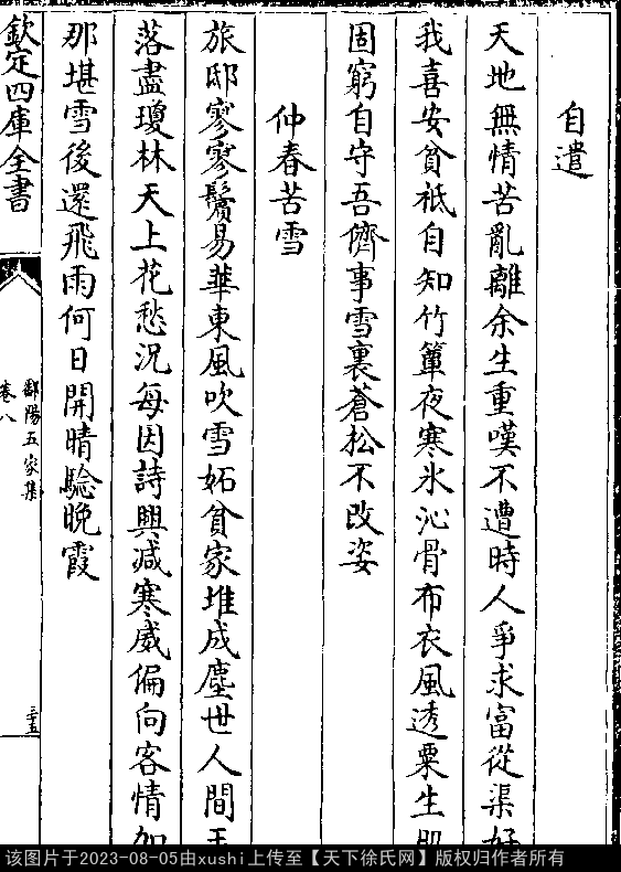 自遣 元 · 徐孜 七言律诗 押支韵 出处:仰山遗稿 天地无情苦乱离,余生重叹不遭时。 人争求富从渠好,我喜安贫祗自知。 竹簟夜寒冰沁骨,布衣风透粟生肌。 固穷自守吾侪事,雪里苍松不改姿。 出处: 《鄱陽五家集-清-史簡》卷八(第 35a - 35b 頁)