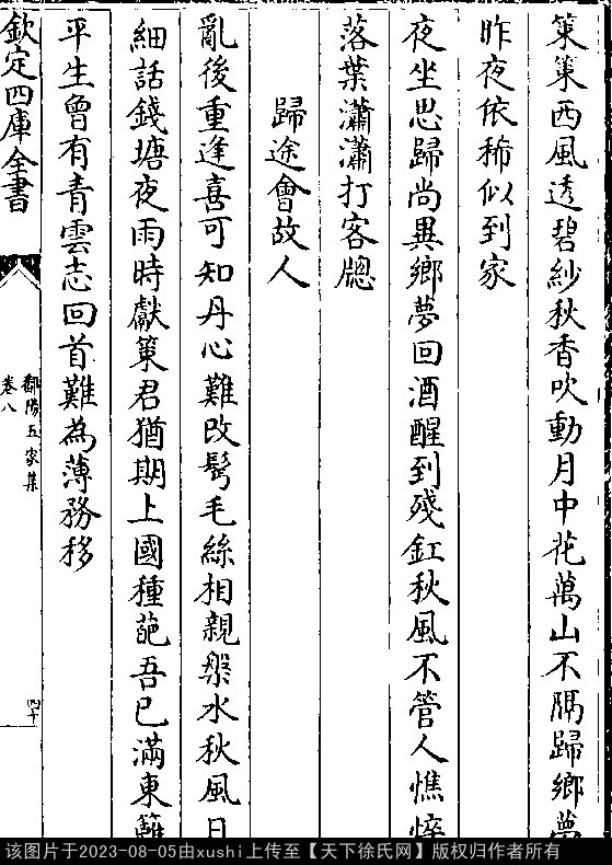 归途会故人 元 · 徐孜 七言律诗 押支韵 出处:仰山遗稿 乱后重逢喜可知,丹心难改鬓毛丝。 相亲槃水秋风日,细话钱塘夜雨时。 献策君犹期上国,种葩吾已满东篱。 平生曾有青云志,回首难为薄务移。 出处: 《鄱陽五家集-清-史簡》卷八(第 40a - 40b 頁)