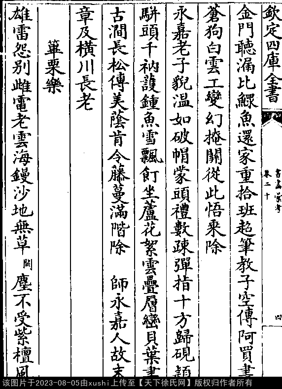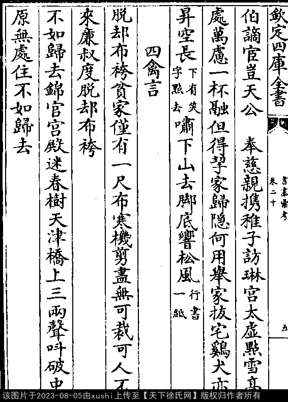 水调歌头 元 · 徐逊 押词韵第一部 盘马万山顶,弹禽群木中。 追思年少行乐,减尽旧豪雄。 三十六峰青矗,三百六滩碧逝,归路杳重重。 拱手问仙伯,谪宦岂天公。 奉慈亲,携稚子,访琳宫。 太虚点雪高处,万虑一杯融。 但得挈家归隐,何用举家拔宅,鸡犬亦升空。 长啸下山去,脚底响松风。 按:式古堂书画题跋卷二十 出处: 《書畫彙考-清-卞永譽》卷二十(第 5a - 6a 頁)