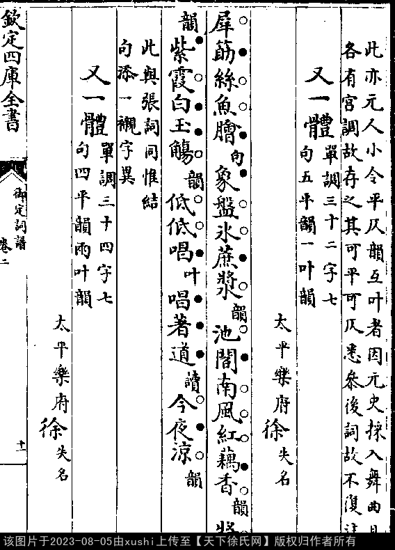 金字经 元 · 徐失名 押阳韵 引用典故:良骥捕鼠 犀箸丝鱼脍,象盘冰蔗浆。 池阁南风红藕香。 将。 紫霞白玉觞。 低低唱。 唱著道、今夜凉。 出处: 《御定詞譜-清-王奕清》卷二目録(第 13a - 13b 頁)